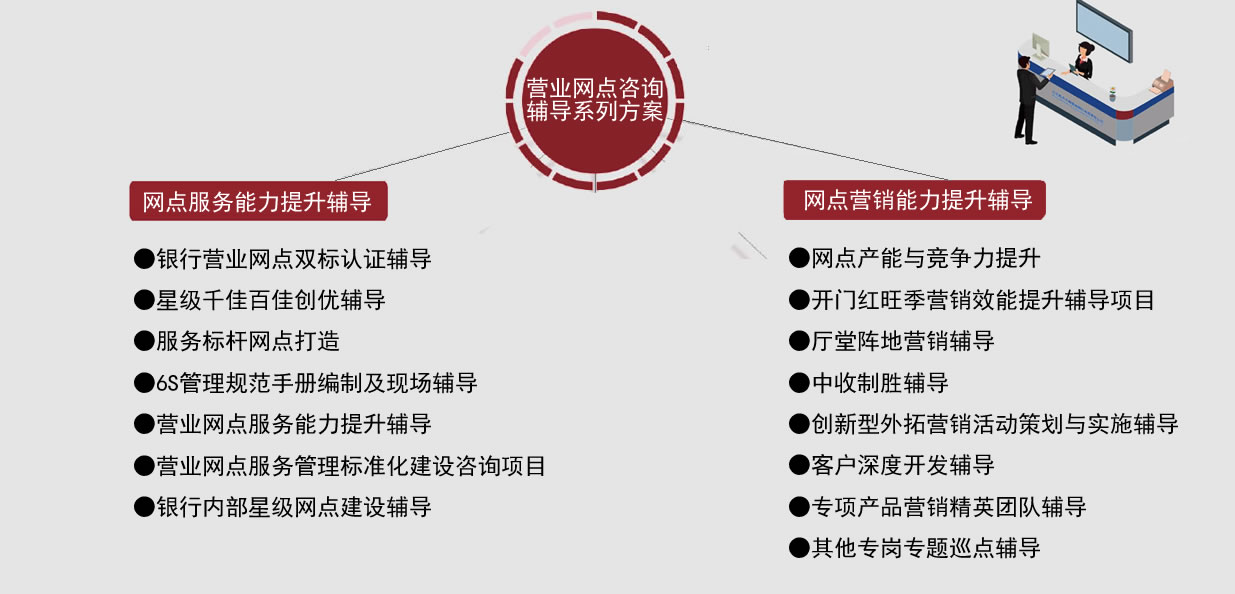 随著(zhe)各家(γ♥jiā)銀(yín)行(xíng)網點轉&'✔£型的(de)逐步推進,标準服務營銷流程難以滿足銀(>★φyín)行(xíng)業(yè)競争的(de)需要(∏ "$yào),網點咨詢輔導進入更為(wèi)精細化(huà)和(♠✘αhé)差異化(huà)的(de)新模式。因客戶需★ε求而變,我們将全部研究能(néng)力聚焦于網點服務 ®↔$能(néng)力提升和(hé)營銷能(néng)力提升兩±←個(gè)領域,研發出系列咨詢輔導方案,并具備為(wèi)銀(→®yín)行(xíng)個(gè)性化(huà)定制(zhì)的(de)服務®✔$能(néng)力。
